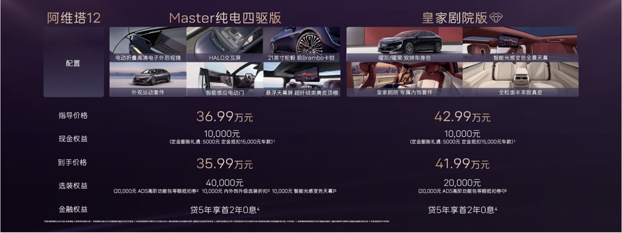 更为惊喜的是,新款阿维塔12还推出了至高5万元的购车权益,包括1万元现金权益和至高4万元配置权益。其中1万元现金权益全系车型均可享受,消费者支付5000元定金即可抵扣15000元车款,权益后到手价低至25.99万元起。