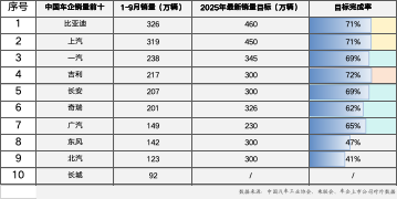 从销量前十车企的竞争格局来看,比亚迪与上汽集团共同占据第一梯队位置,1-9 月累计销量均突破 300 万辆。其中,比亚迪以 326 万辆的累计销量稳居行业榜首,已顺利完成其全年 460 万辆最新销量目标的 71%,凭借在新能源领域的技术优势与产品矩阵,持续巩固行业领先地位。上汽集团同期累计销量达 319万辆,全年目标完成率同样为 71%,在燃油车市场稳步推进、新能源车型加速布局的 “双线并行” 策略下,保持了稳健的增长节奏。