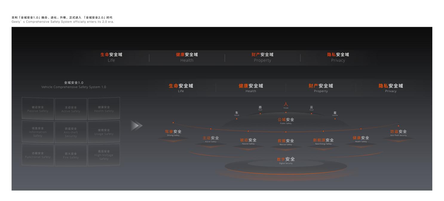 “全域安全2.0”技术体系延续了生命安全、健康安全、财产安全、隐私安全四大安全域,并将九大安全系统迭代升级为驾驶安全、主动安全、被动安全、救援安全、健康安全、新能源安全、防盗安全、数字安全、公域安全。