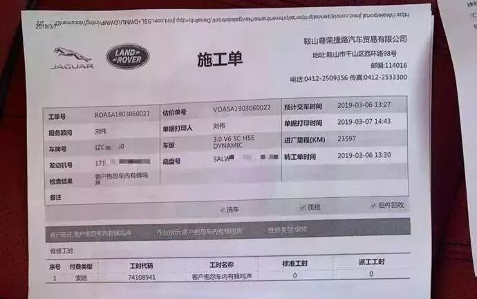 接待他们的是鞍山尊荣捷路服务顾问刘伟。韩先生提供的“施工单”和“试车确认单”上分别有“刘伟”和“苏士鑫”的签字,“施工单”上“检查结果”内容为:“客户抱怨车内有蜂鸣声”。