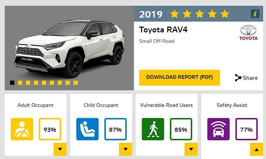 全新第五代丰田RAV4也会在今年进入中国市场,Euro NCAP测试的这台RAV4为Hybrid AWD(混合动力 适时四驱)车型,并且是标配各项安全防护系统的车型,依然拿下五颗星最佳测试成绩。其中车内乘客的防护率达到93%、儿童防护率87%以及行人防护率达85%之外,安全辅助系统(包括AEB自动刹车、车道偏离辅助等)更有77%的防护能力。