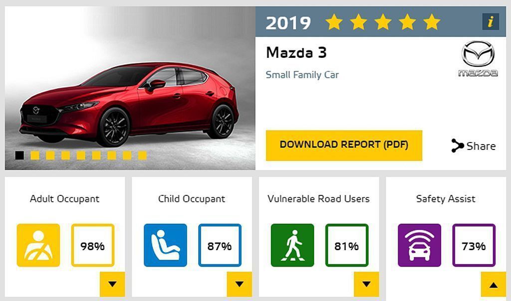 全新第四代马自达3除外型设计更犀利典雅外,底盘平台也率先使用最新SKYACTIV-Vehicle Architecture架构,在整体车身刚性更强的表现下,撞击测试成绩也直接反应在数据上,不仅获得五颗星最高评价,车内乘客的防护率更高达98%,亦有望成为今年度Euro NCAP最佳推荐新车。真希望国内上市的长安马自达3也如此优秀。