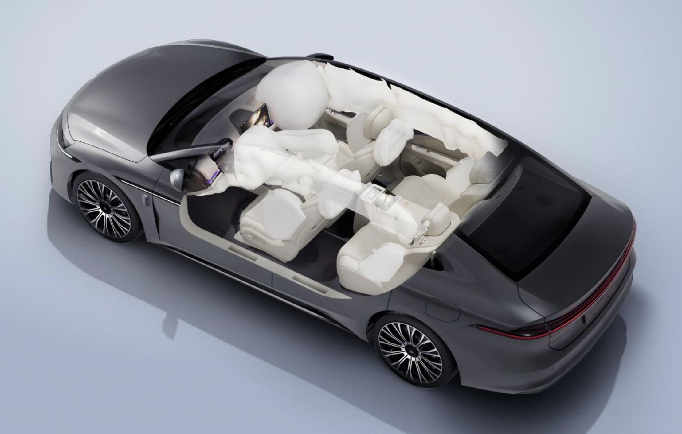 硬件层面,新车搭载双腔空气弹簧、SDC减振器及保时捷同款高性能多连杆后悬架,加上高速爆胎防失控、智能防晕车等技术,实现了操控与舒适的平衡。安全上,昊铂A800完成61项测试(国标6倍),配备同级最多的14个气囊,包括国内同级首个二排正面气囊;弹匣电池2.0通过比针刺更严苛的枪击试验,八大系统(定位、感知、计算等)均做冗余设计,为整车加上“双保险”。