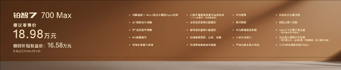 700km续航提供三个版本,全部标配双电机零重力座椅、主驾大腿托、后排智能触控面板和23扬声器等超11项配置,过往30万以上车型的豪华舒适配置,全部下放到20万以下。700Max版聚焦长续航与高阶舒适,限时补贴权益价16.58万,加5000元即可选装行业最低价的双腔空悬,拥有17万级双腔空悬纯电家轿第一车。700Max激光雷达版限时补贴权益价17.48万,增加Momenta R6大模型高阶智驾辅助。再加5000元选装基金即可升级至700Max激光雷达双腔空悬版,一次性配齐华为鸿蒙座舱5、Momenta R6大模型激光雷达智驾、双腔空悬等超豪华三件套,20万内唯一。