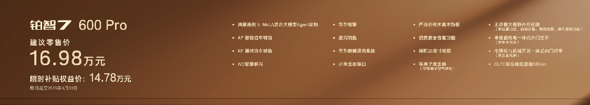 铂智7600Pro版,版本基础配置不基础,入门即豪华,限时补贴权益价14.78万。同价位最大尺寸旗舰轿车,标配内置MoLA架构的鸿蒙座舱5,具备类人化智能交互,搭载带智能泊车的L2级智驾、华为智擎、尊界同款星闪钥匙、纯天然实木内饰和座椅通风加热、20寸轮毂等超15项豪华配置。D级车的尺寸和享受,B级车的价位,加上丰田全球品质兜底,性价比断层领先。