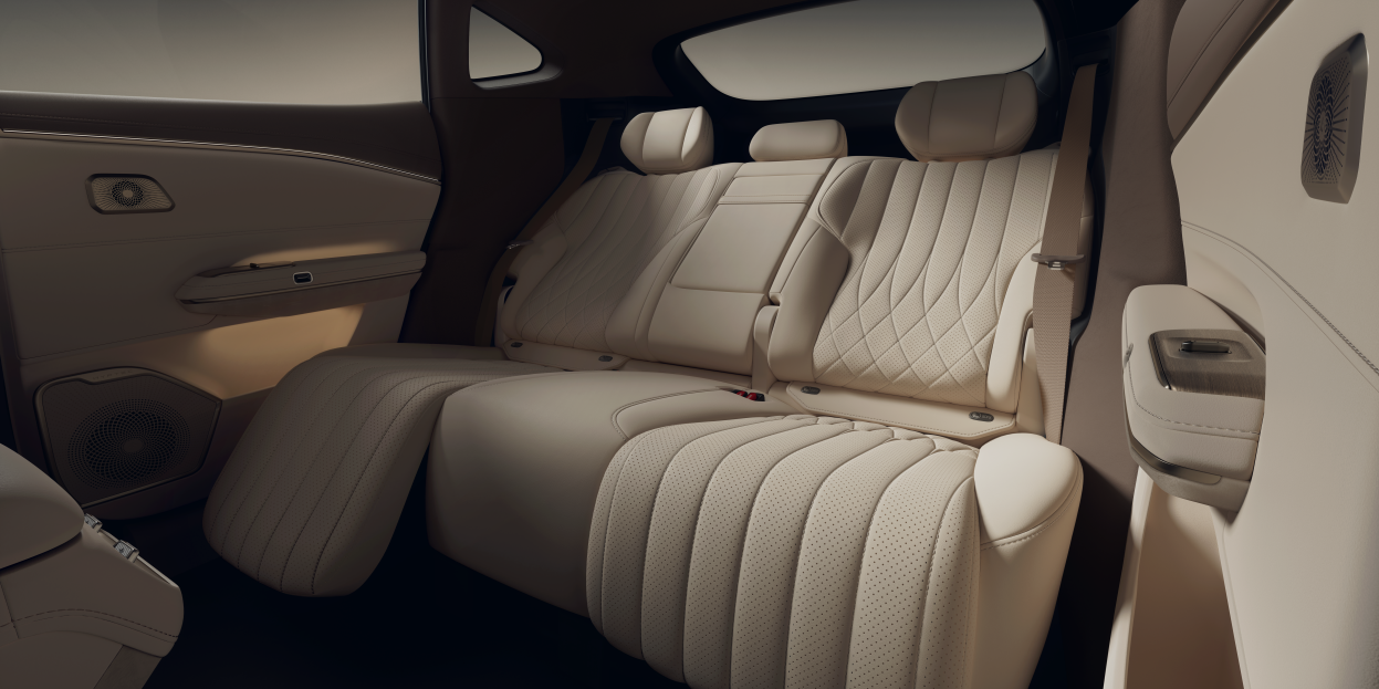舒适配置也一步到位。143度后排电调天王椅、全车大面积软包、22扬ADiGO SOUND音响、智能新风系统、四门无框电吸门、五块双层夹胶静音玻璃、后排隐私玻璃、后排小桌板、2.34平方米超大全景天幕、电动遮阳帘、行业独创的第三代热泵系统等,统统标配。