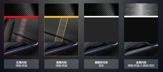 内饰有四种风格,分别是红黑、黄黑、猎装灰和全黑,不同的内饰在用料和配色上有所区别。