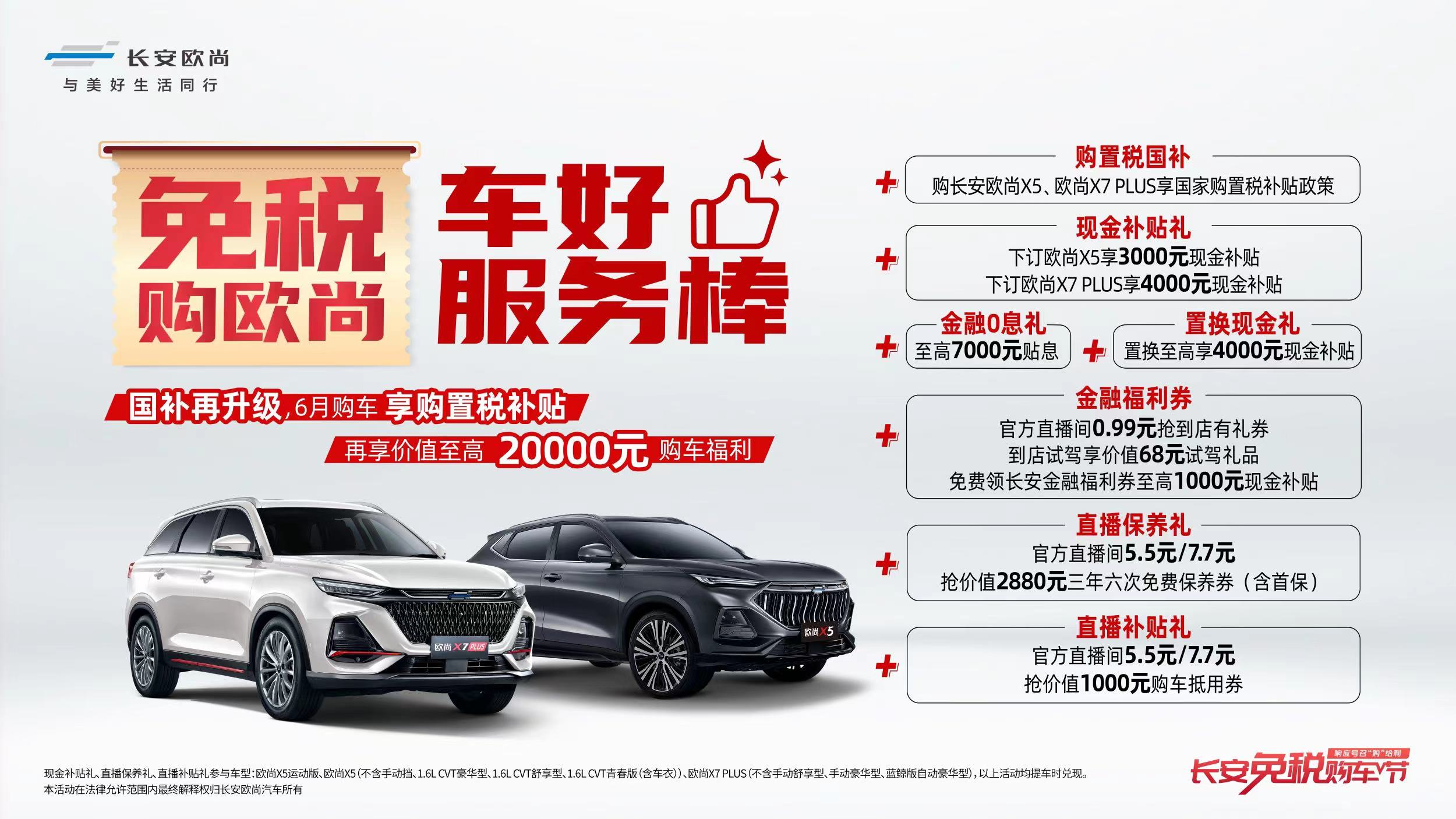消息一出,欧尚汽车便第一时间给予响应,发起“免税购欧尚 车好服务棒”活动。简单来说就是,6月购欧尚汽车除了享购置税补贴外,还可享至高2万元购车福利。同时,下订欧尚X5与欧尚X7PLUS还将享3000元与4000元现金补贴。