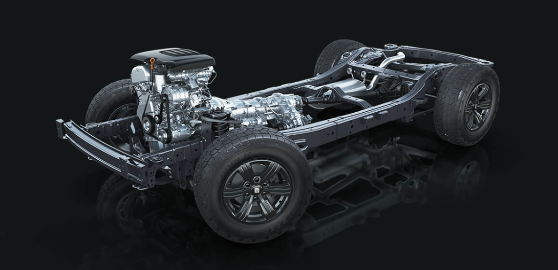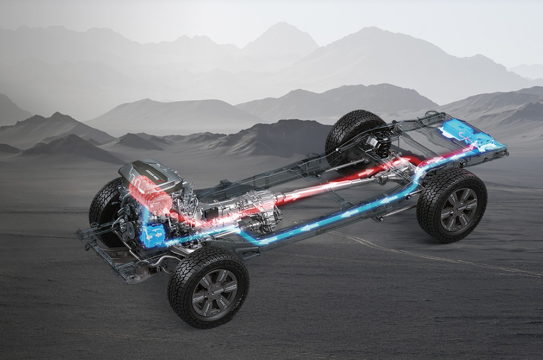 动力总成上领地采用了“轩辕动力”,由最大功率160kW,峰值扭矩500Nm的2.0双涡轮增压柴油发动机+48V轻混系统组成。而坦克300则采用了最大功率167 kW,峰值扭矩387Nm的单涡轮汽油发动机。两款车型使用的变速箱均为8速自动变速箱。在“越野”这个使用场景下,柴油机相比汽油机的优势主要体现在更低的油耗与更大的扭矩。领地在不加装副油箱的原厂状态下就能实现1000公里的续航里程,而更大的峰值扭矩在爬坡与脱困的工况下更具优势。
