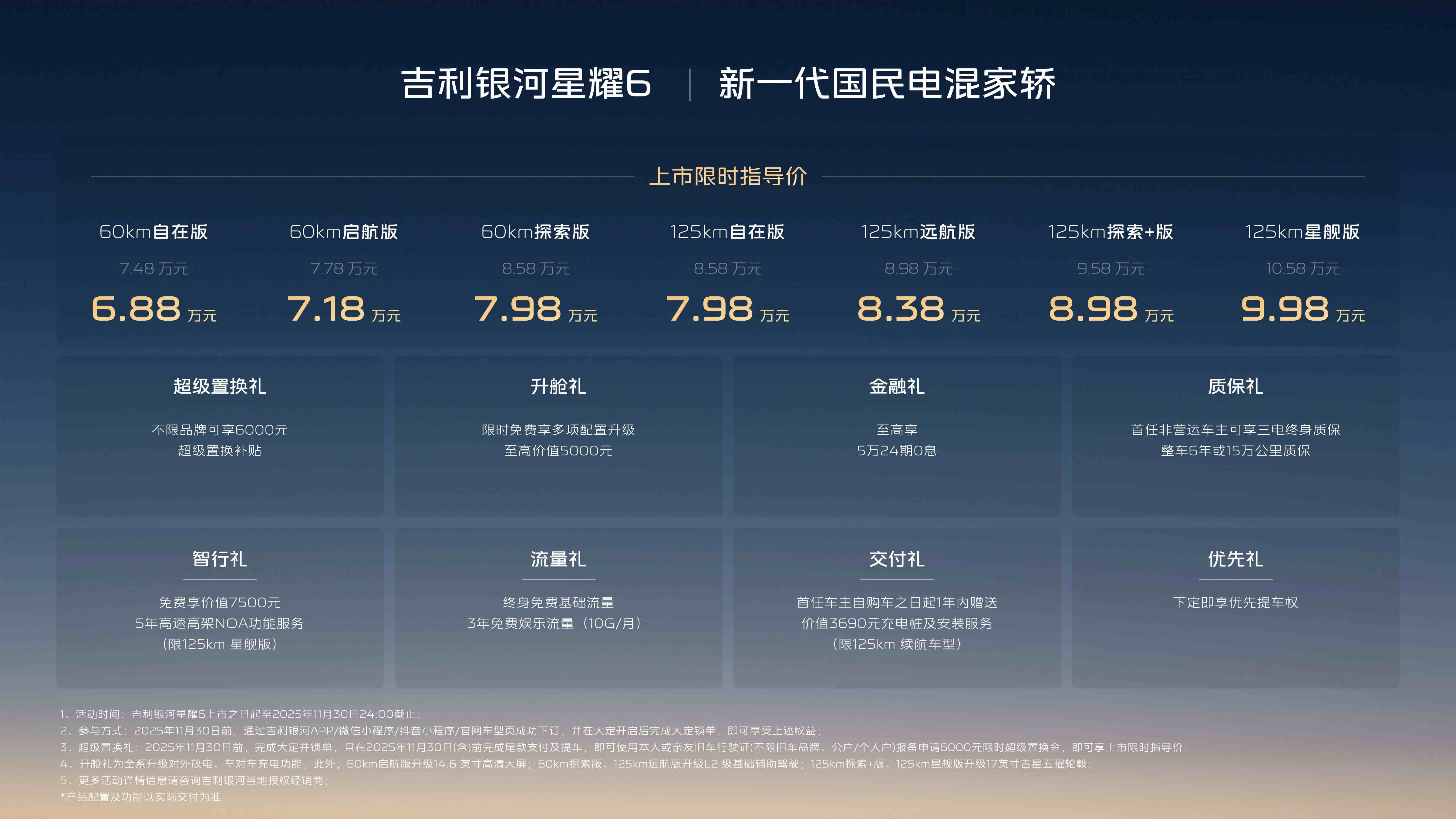 10月30日,吉利银河星耀6正式全球上市,以6.88万元至9.98万元的限时指导价,推出共7款配置车型,全面覆盖主流电混家轿市场。新车不仅以极具竞争力的价格切入市场,更以“三大最省成本”和“四大越级满配”为核心卖点,重新定义了什么才是真正意义上的“国民家轿”。