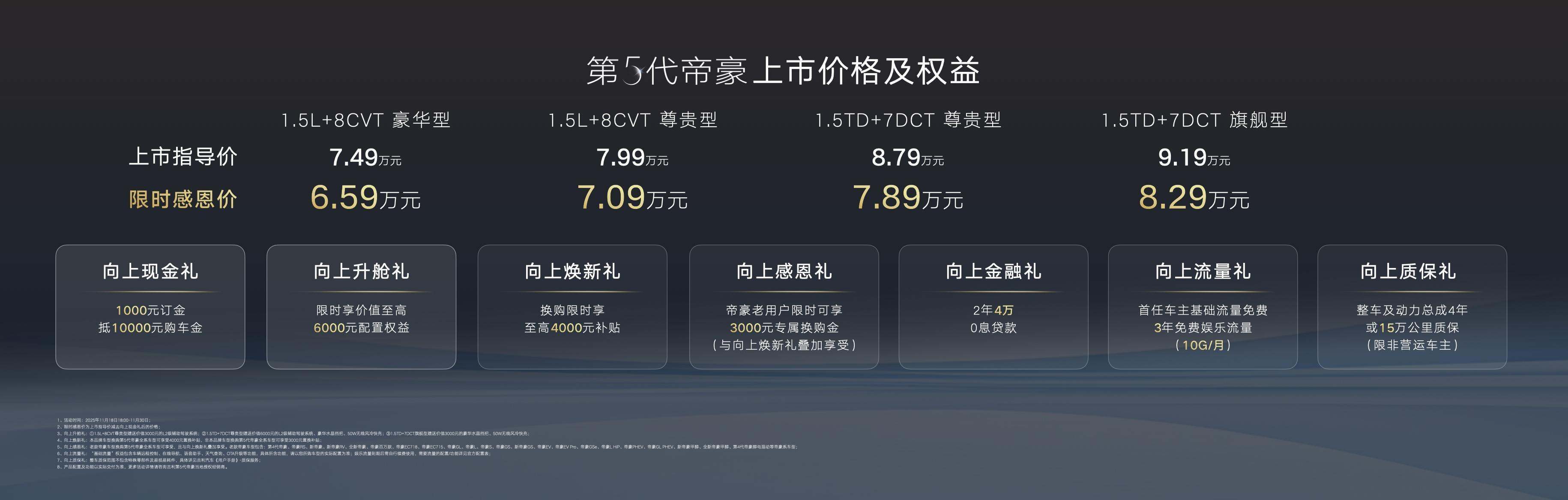 在中国汽车工业从“追赶”迈向“引领”的进程中,帝豪始终是一个不可忽视的标志。十六年,五代车型,400万用户——这不仅是一个品牌的成长史,更是中国家庭轿车从功能代步走向品质出行的缩影。2024年11月,第5代帝豪以6.59-8.29万元的限时感恩价正式上市,看似是一次常规的车型换代,实则是一场针对A级燃油家轿市场的系统性重构。