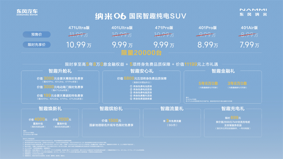 大可玩,尽情6。5月27日,东风纳米旗下“国民智趣纯电SUV”东风纳米06在武汉正式上市,限时先享价为7.99万元-10.99万元。作为一个听劝的品牌,东风纳米06为用户带来7大诚意权益,包括电动尾门和全景天幕限时送、五项终身免费品质保障、中国国家地理联名外观车色限时免费享、最高4000元置换补贴、至高享“5年8万0息”、送3年免费流量、699元享价值2699元充电桩及安装服务等众多的超有诚意权益。当产品超过期待、价格超出期待、品质越级领先,是给予用户最大的诚意,也是东风纳米赋能国民极致美好生活的最大底气。